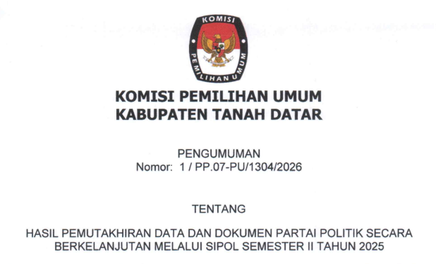 PENGUMUMAN Nomor: 1/PP.07-PU/1304/2026 TENTANG HASIL PEMUTAKHIRAN DATA DAN DOKUMEN PARTAI POLITIK SECARA BERKELANJUTAN MELALUI SIPOL SEMESTER II TAHUN 2025 Senin, 05 Januari 2026 09:21 42 lihas selengkapnya disini Bagikan: Dilihat 42 Kali.