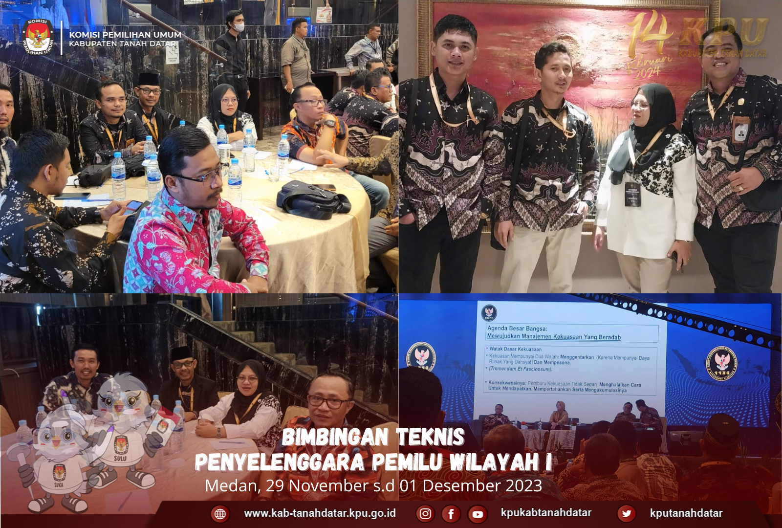 #sobat JDIH, Medan/ 29 November 2023 -KPU Tanah Datar mengikuti Bimbingan Teknis Penyelenggara Pemilu Wilayah I yang dilaksanakan oleh Dewan Kehormatan Penyelenggara Pemilu (DKPP), di Kota Medan /29 November 2023 – 1 Desember 2023. Bimtek dilaksanakan di LePolonia Hotel & Convention dan diikuti oleh seluruh Jajaran KPU dan Bawaslu yang diwakili oleh Divisi Hukum dan Pengawasan di lingkup Wilayah I, meliputi : Provinsi Aceh, Sumatera Utara, Sumatera Barat, Kepulauan Riau, Riau, Jambi, Bengkulu, dan Bangka Belitung. Hadir pada kegiatan itu Pangdam 1 Bukit Barisan, Kapolda Sumut, Ketua KPU Sumut, Ketua Bawaslu Sumut, serta seluruh peserta dari KPU Bawaslu serta TPD se Sumatera. Untuk KPU Kabupaten Tanah Datar dihadiri oleh Ketua Divisi Hukum dan Pengawasan, Nini Karlina.