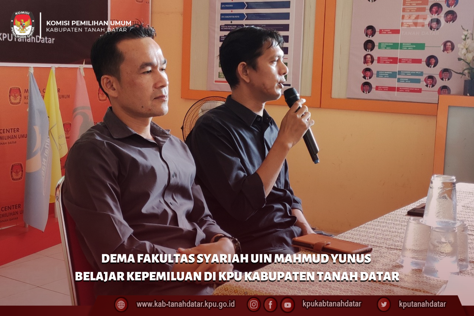 kab-tanahdatar.kpu.go.id - #temanpemilih, hari ini Kamis/ 11 agustus 2022 bertempat di Ruang pertemuan RPP KPU Tanah Datar, Dewan Eksekutif Mahasiswa (Dema) Fakultas Syariah UIN Mahmud Yunus Batusangkar yang terdiri pengurus Dema dan pengurus HMJ Hukum Tata negara, HMJ Ahwalus Syakhsiyah, dan HMJ hukum Ekonomi Syariah melakukan kunjungan ke KPU Tanah Datar dalam rangka belajar kepemiluan dan Demokrasi. Para aktifis ini disambut Ketua KPU Tanah Datar Fahrul Rozi, dan anggota Tomas Hendriko dan Erlonadi. Sekretaris Sonata, SE dan kasubbag Tekmas Fimawati dan jajaran sekretariat.