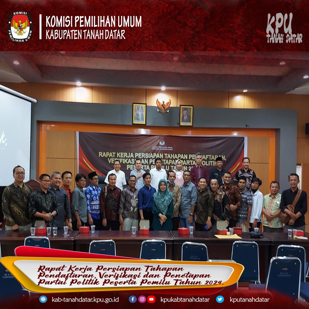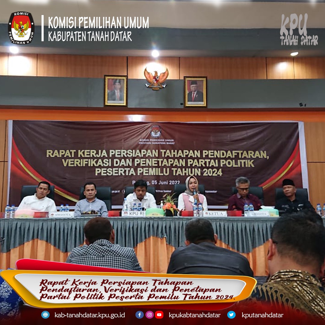Tanah Datar - kab-tanahdatar.kpu.go.id, Minggu 5 Juni 2024, KPU Provinsi Sumatera Barat melaksanakan Rapat Kerja Persiapan Tahapan Pendaftaran, Verifikasi dan Penetapan Partai Politik yang diikuti oleh Ketua Divisi Teknis dan Kasubbag Teknis dan Hubparmas KPU Kabupaten/Kota Se-Sumatera Barat dan di hadiri oleh Ketua dan Anggota KPU Sumatera Barat serta juga di hadiri oleh Anggota KPU RI DR. H. Idham Kholik, M.Si. KPU Kabupaten Tanah Tanah Datar diwakili oleh Ketua Divisi Tenis Erlonadi dan Kasubbag Teknis dan Hubparmas Fima Wati di Aula KPU Provinsi Sumatera Barat.