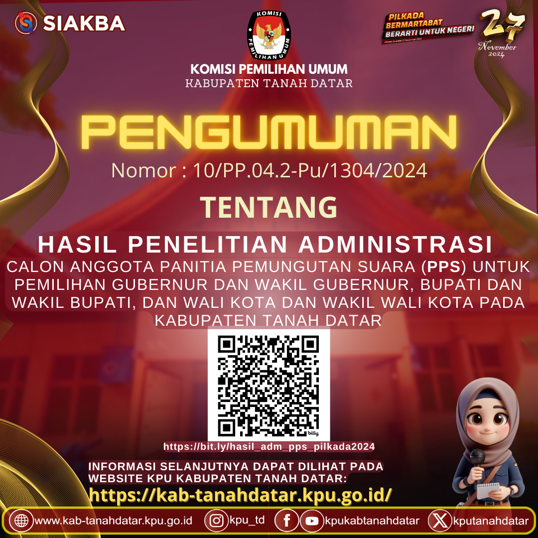 HASIL SELEKSI PENELITIAN ADMINISTRASI PPS PILKADA 2024 Senin, 13 Mei 2024 07:00 564 Info selengkapnya Dapat dilihat disini Bagikan: Dilihat 564 Kali.