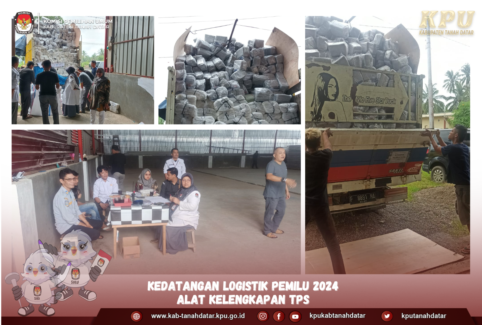 Batusangkar, Senin/ 4 Desember 2024 – KPU Tanah Datar kedatangan Logistik tahap kedua. Logistik datang di Gudang KPU Tanah Datar pada Senin Pagi, dan di monitoring oleh Komisioner KPU Tanah Datar, Bawaslu Tanah Datar, serta Kepolisian Tanah Datar. Pihak penerima melakukan serah terima Logistik Pemilu 2024 berupa Alat Bantu Coblos dan Label Identitas Kotak Suara, berupa : Paku, Tali, Bantalan, Bolpoint Biru, Spidol Kecil, Tanda Pengenal, Lem, Karet dan Plastik Ziplok. Logistik yang datang sesuai dengan pengajuan pada aplikasi SILOG dan sesuai dengan kebutuhan KPU Kabupaten Tanah Datar. – KPU TD