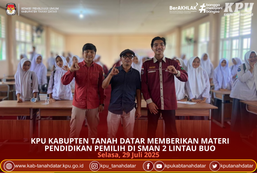 #temanpemilih Menindaklanjuti kolaborasi Sekolah Demokrasi HMPS Pemikiran Politik Islam UIN Mahmud Yunus Batusangkar, KPU Tanah Datar memberikan pendidikan politik kepada Siswa dan Siswi SMA Negeri 2 Lintau Buo pada Selasa, 29 Juli 2025, di Aula SMA Negeri 2 Lintau Buo.