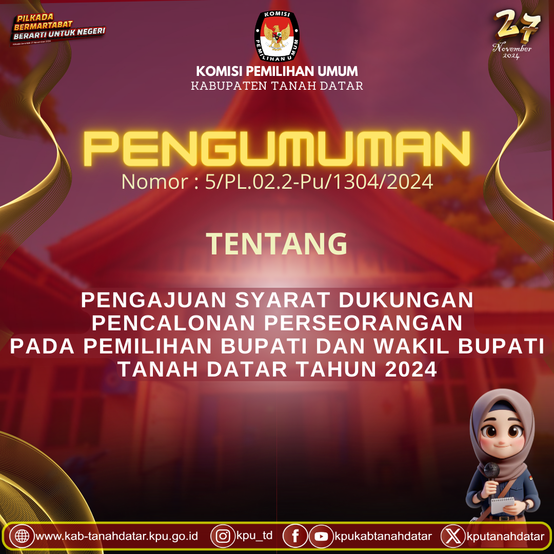Pengumuman nomor: 5/PL.02.2-Pu/1304/2024 tentang PENGAJUAN SYARAT DUKUNGAN PENCALONAN PERSEORANGAN PADA PEMILIHAN BUPATI DAN WAKIL BUPATI TANAH DATAR TAHUN 2024