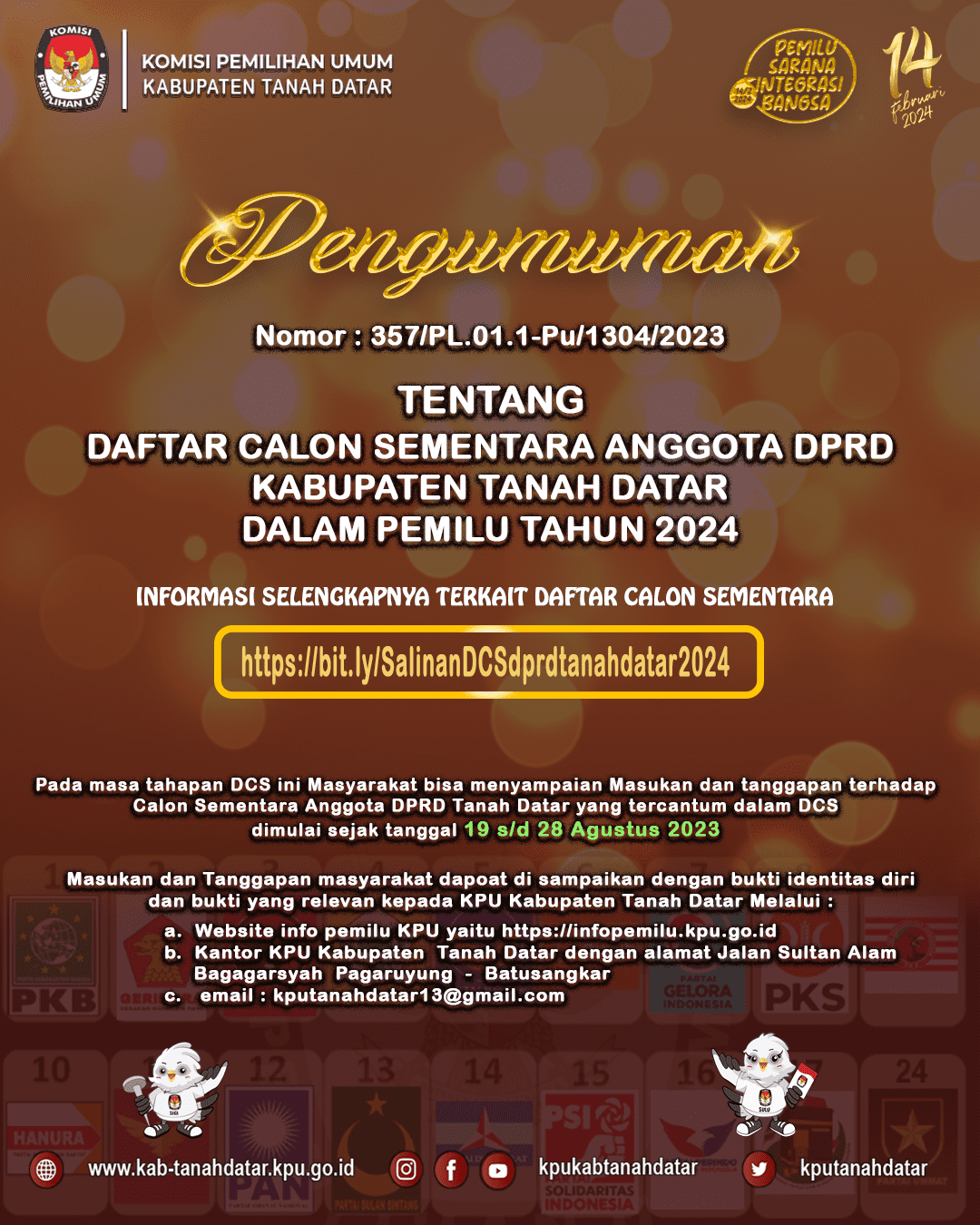#temanpemilih KPU Kabupaten Tanah Datar mengumumkan Daftar Calon Sementara (DCS) Anggota DPRD Tanah Datar dalam Pemilu Tahun 2024