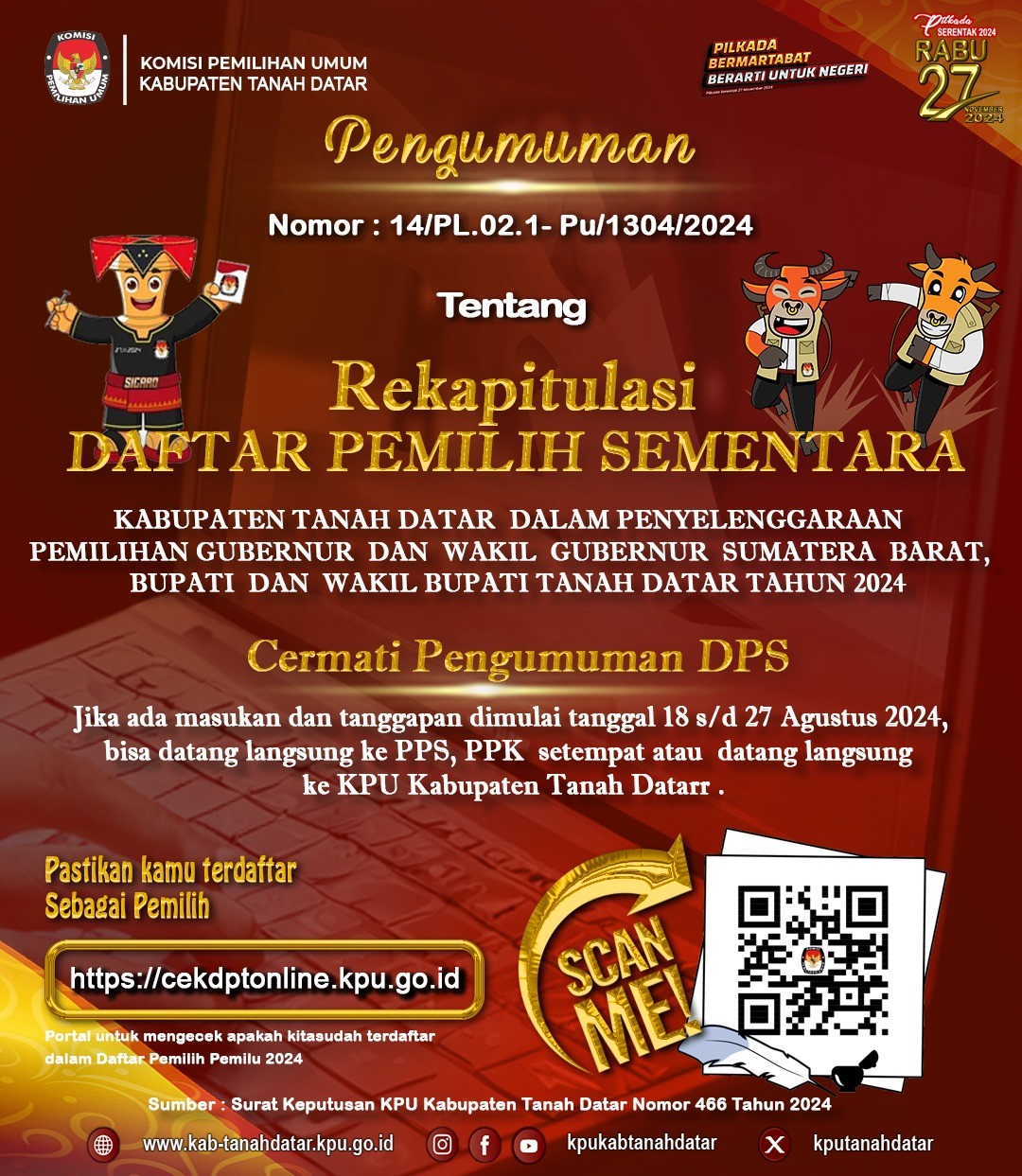 Batusangkar - Hai Teman Pemilih, Bersama ini KPU Tanah Datar sampaikan Rekapitulasi Daftar Pemilih Sementara (DPS) Kabupaten Tanah Datar dalam penyelenggaraan pemilihan Gubernur dan Wakil Gubernur Sumatera Barat , Bupati dan Wakil Bupati Tanah Datar Tahun 2024. Cermati pengumuman DPS, Jika ada masukan dan tanggapan dimulai tanggal 18 s/d 27 Agustus 2024, bisa datang langsung ke PPS, PPK setempat atau datang langsung ke KPU Kabupaten Tanah Datarr .