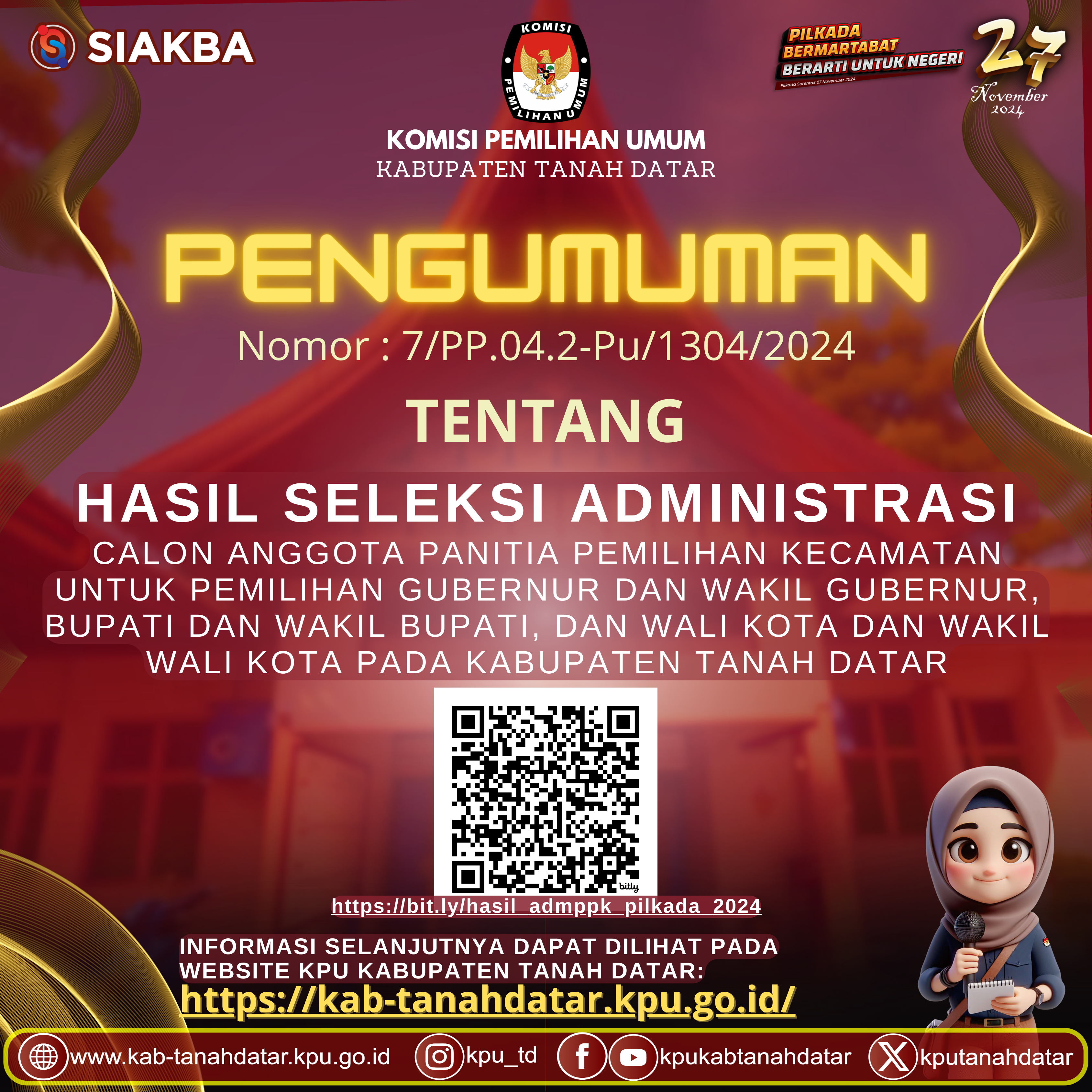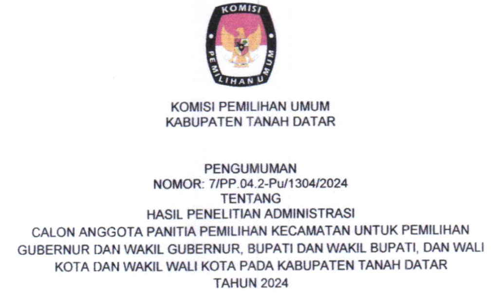 Pengumuman nomor 7/PP.04.2-Pu/1304/2024 tentang hasil penelitian administrasi calon anggota Panitia Pemilihan Kecamatan untuk Pemilihan Gubernur dan Wakil Gubernur, Bupati dan Wakil Bupati, dan Wali Kota dan Wakil Wali Kota pada Kbaupaten Tanah Datar tahun 2024