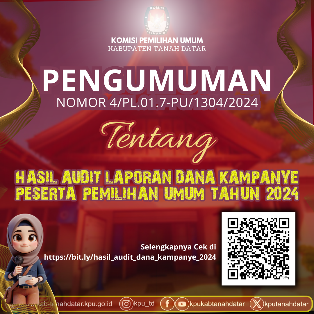Tanah Datar - kab-tanahdatar.kpu.go.id, Berdasarkan Laporan Hasil Audit Laporan Dana Kampanye Peserta Pemilihan Umum Tahun 2024 Oleh Kantor Akuntan Publik yang telah ditunjuk Oleh KPU Provimsi Sumatera Barat disampaikan hasil Audit Laporan Dana Kampanye Peserta Pemilihan Umum Yang selengkapnya dapat di unduh DISINI
