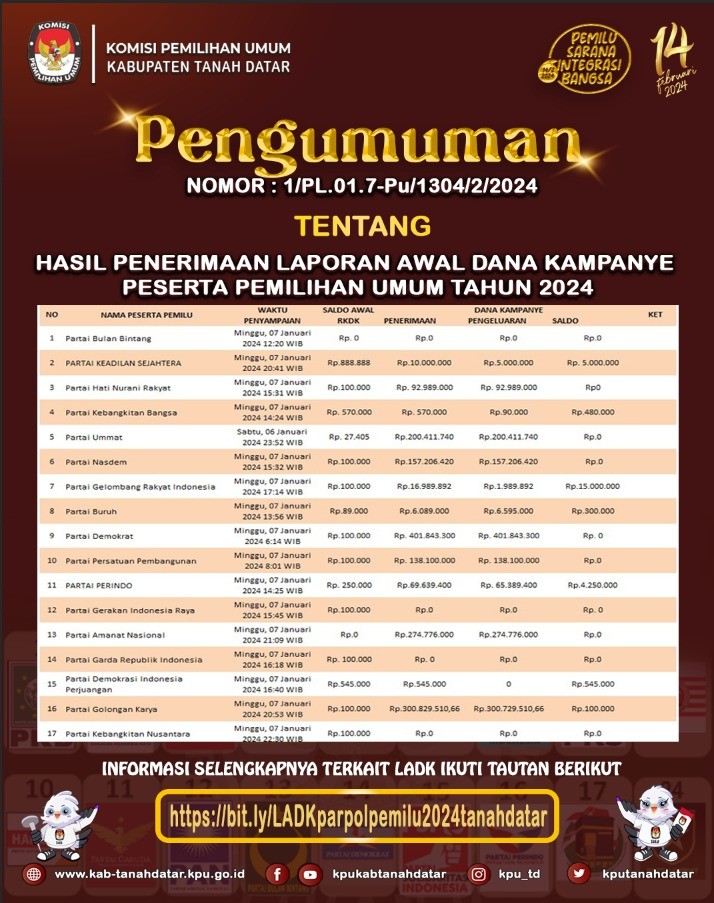 Pengumuman Nomor 1/PL.01.7-Pu/1304/2/2024 tentang Hasil Penerimaan Laporan Awal Dana Kampanye Peserta Pemilihan Umum Tahun 2024
