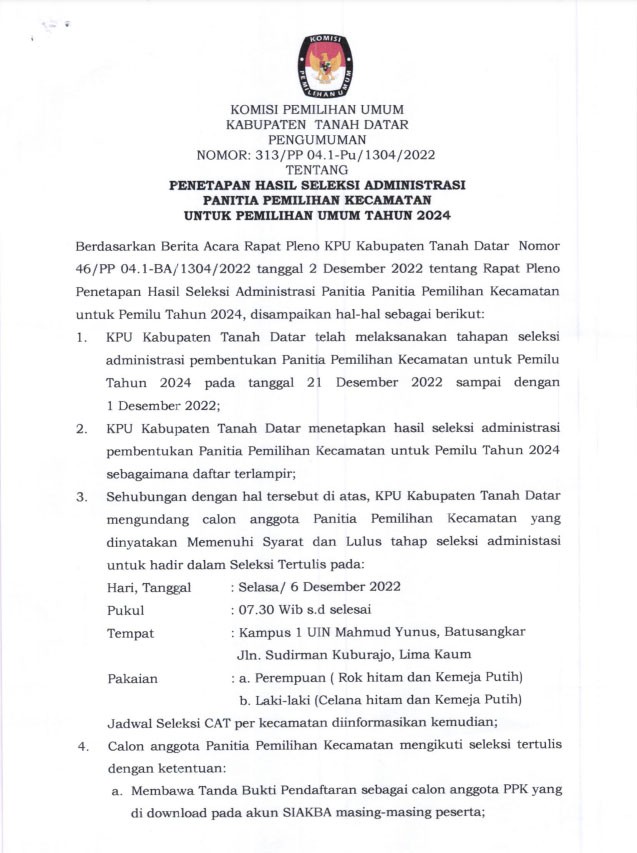 Pengumuman Hasil Seleksi Administrasi Panitia Pemilihan Kecamatan Pemilihan Umum Tahun 2024 Komisi Pemilihan Umum Kabupaten Tanah Datar dapat di unduh di tautan berikut ini Download disini