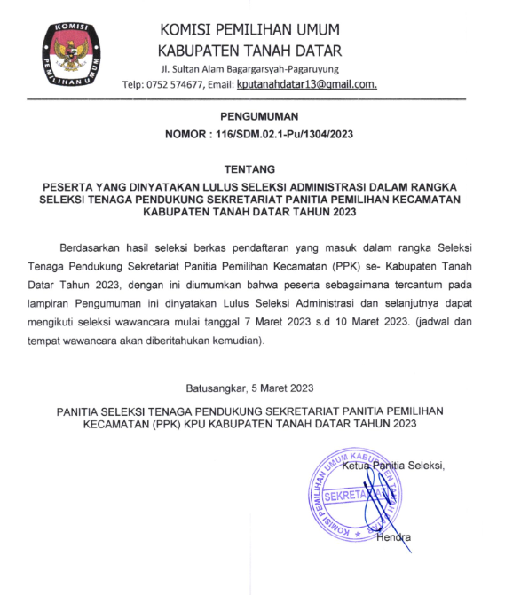 Berdasarkan hasil seleksi berkas pendaftaran yang masuk dalam rangka Seleksi Tenaga Pendukung Sekretariat Panitia Pemilihan Kecamatan (PPK) se- Kabupaten Tanah Datar Tahun 2023, dengan ini diumumkan bahwa peserta sebagaimana tercantum pada lampiran Pengumuman ini dinyatakan Lulus Seleksi Administrasi dan selanjutnya dapat mengikuti seleksi wawancara mulai tanggal 7 Maret 2023 s.d 10 Maret 2023. (ladwal dan tempat wawancara akan diberitahukan kemudian).