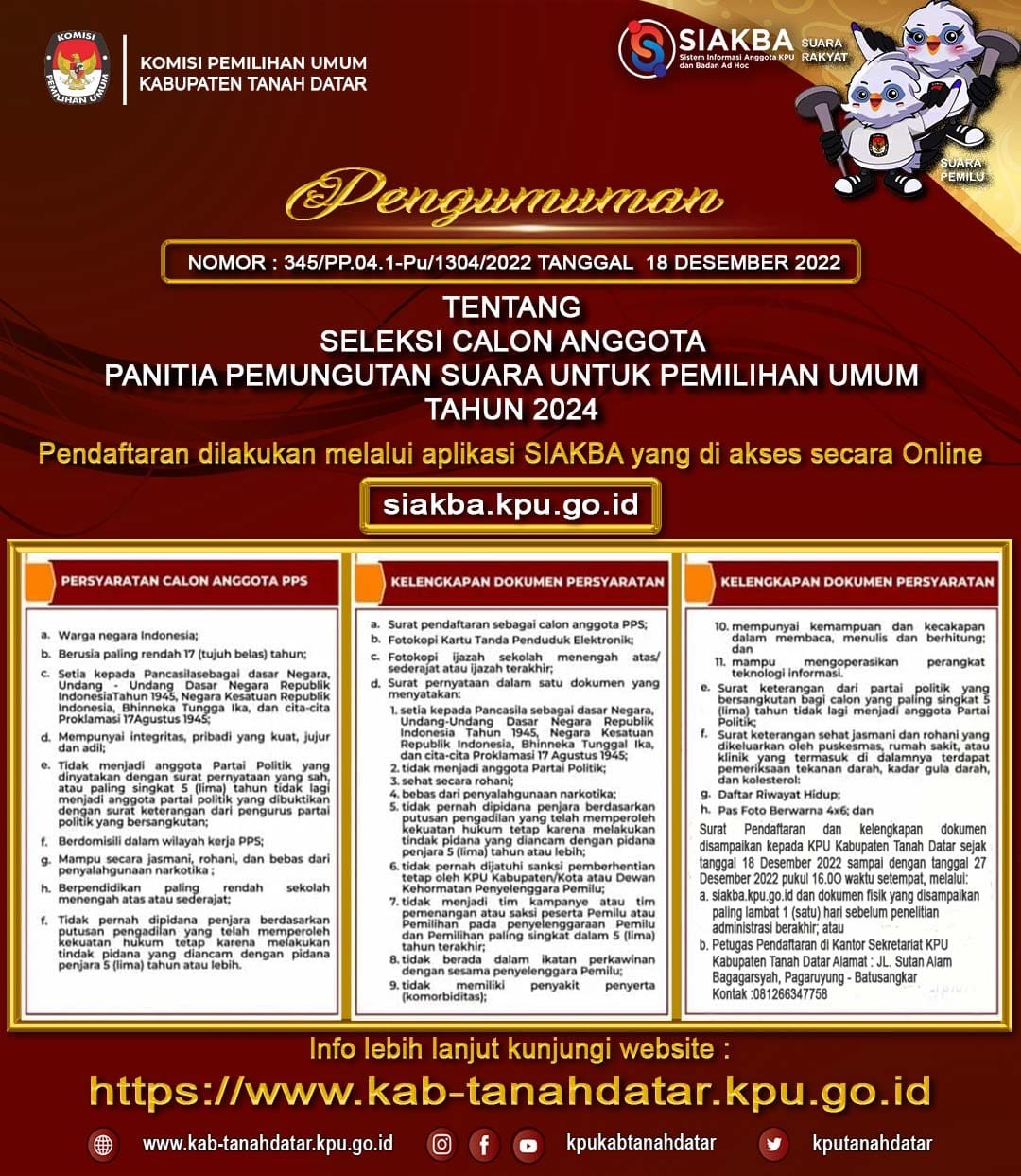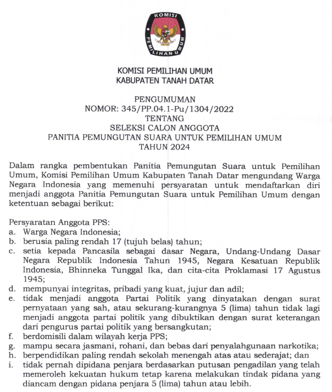 Pengumuman Nomor : 345 /PP.04.1-Pu/1304/2022 Tanggal 18 Desember 2022 Tentang Seleksi Calon Anggota Panitia Pemungutan Suara Pemilihan Umum Tahun 2024 Komisi Pemilihan Umum Kabupaten Tanah Datar. Selengkapnya dapat di unduh di tautan berikut ini Download disini