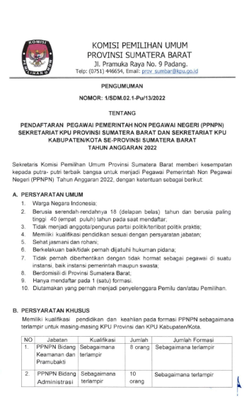 PENGUMUMAN NOMOR: 1/SDM.02.1-Pu/13/2022 TENTANG PENDAFTARAN PEGAWAI PEMERINTAH NON PEGAWAI NEGERI (PPNPN) SEKRETARIAT KPU PROVINSI SUMATERA BARAT DAN SEKRETARIAT KPU KABUPATEN/KOTA SE-PROVINSI SUMATERA BARAT TAHUN ANGGARAN 2022