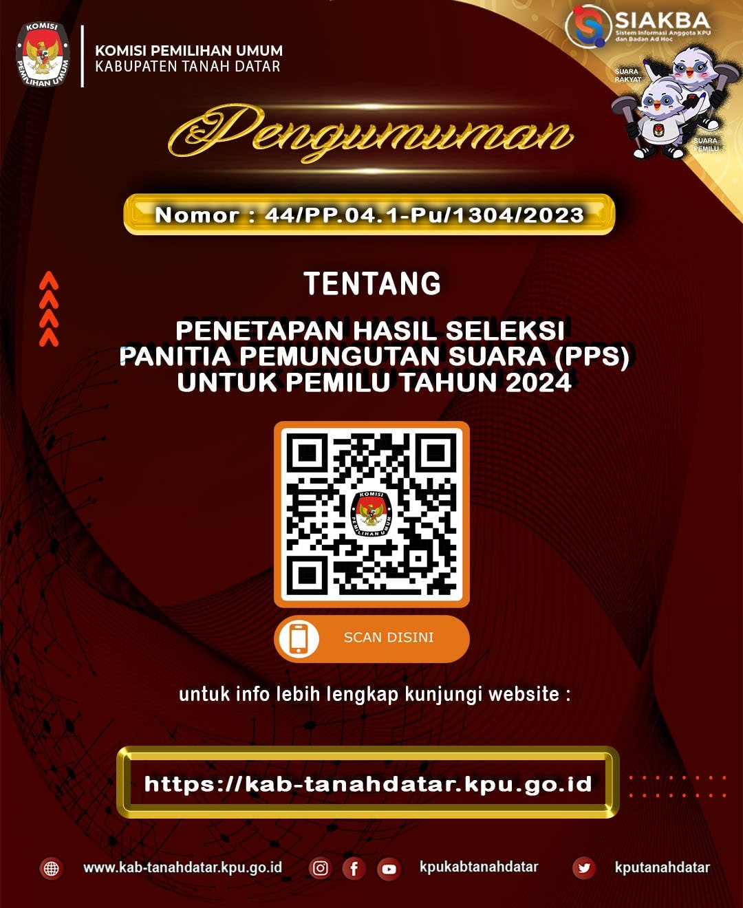 #TemanPemilih, berikut disampaikan pengumuman hasil seleksi calon anggota PPS Pemilu 2024 dan jadwal pelantikan, pengambilan sumpah/janji dan penandatanganan pakta integritas anggota PPS terpilih.