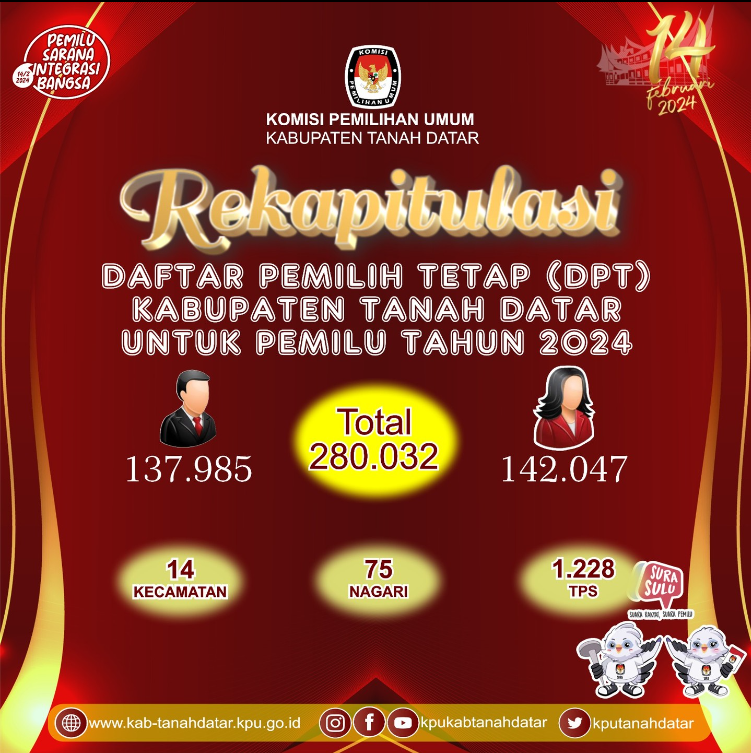 Sebanyak 280.032 pemilih sudah terdaftar yang tersebar di 75 Nagari dan 14 kecamatan di Tanah Datar. Silahkan Unduh Disini