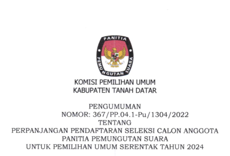PENGUMUMAN PERPANJANGAN PENDAFTARAN SELEKSI CALON ANGGOTA PANITIA PEMUNGUTAN SUARA UNTUK PEMILIHAN UMUM SERENTAK TAHUN 2024