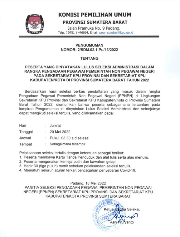 #Temanpemilih PENGUMUMAN KOMISI PEMILIHAN UMUM PROVINSI SUMATERA BARAT NOMOR: 2/SDM.02.1-Pu/13/2022 TENTANG PESERTA YANG DINYATAKAN LULUS SELEKSI ADMINISTRASI DALAM RANGKA PENGADAAN PEGAWAI PEMERINTAH NON PEGAWAI NEGERI PADA SEKRETARIAT KPU PROVINSI DAN SEKRETARIAT KPU KABUPATEN/KOTA DI PROVINSI SUMATERA BARAT TAHUN 2022
