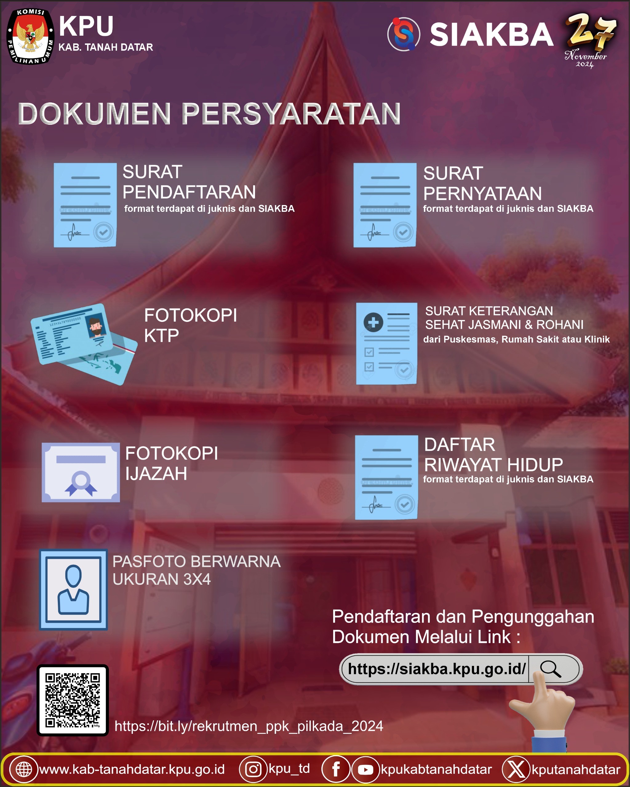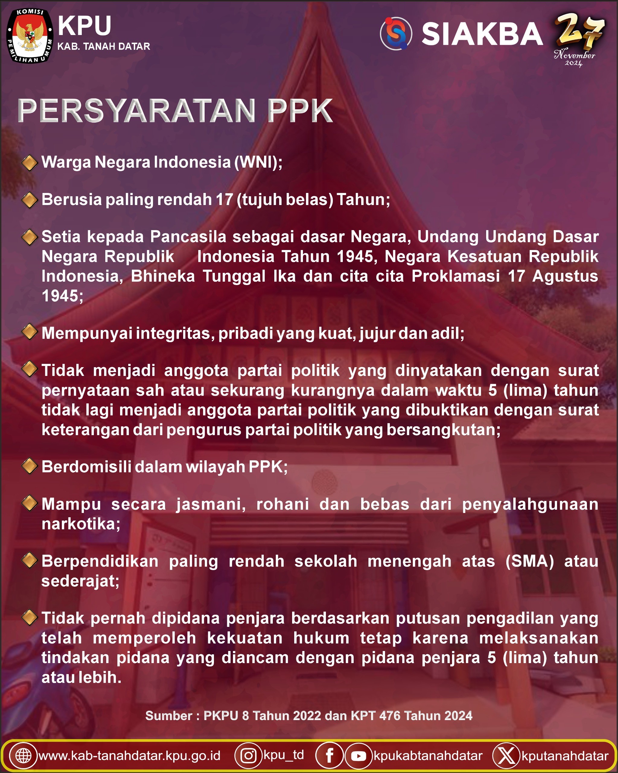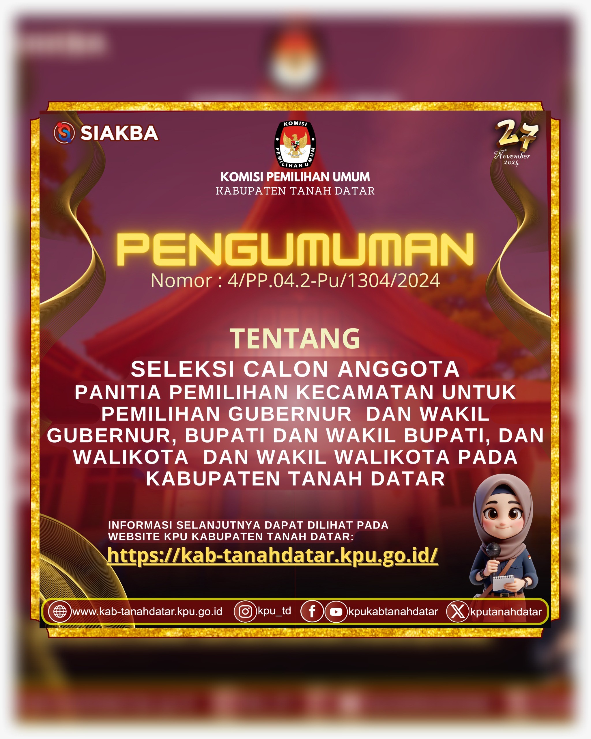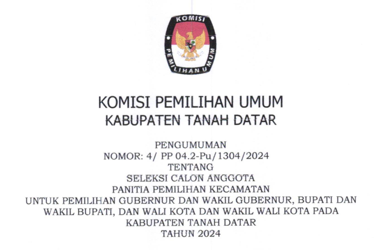 Pengumuman nomor 4/PP.04.2-Pu/1304/2024 tentang Seleksi calon anggota Panitia Pemilihan Kecamatan untuk pemilihan GUbernur dan Wakil Gubernur, Bupati dan Wakil Bupati, dan Walikota dan Wakil Walikota pada Kabupaten Tanah Datar