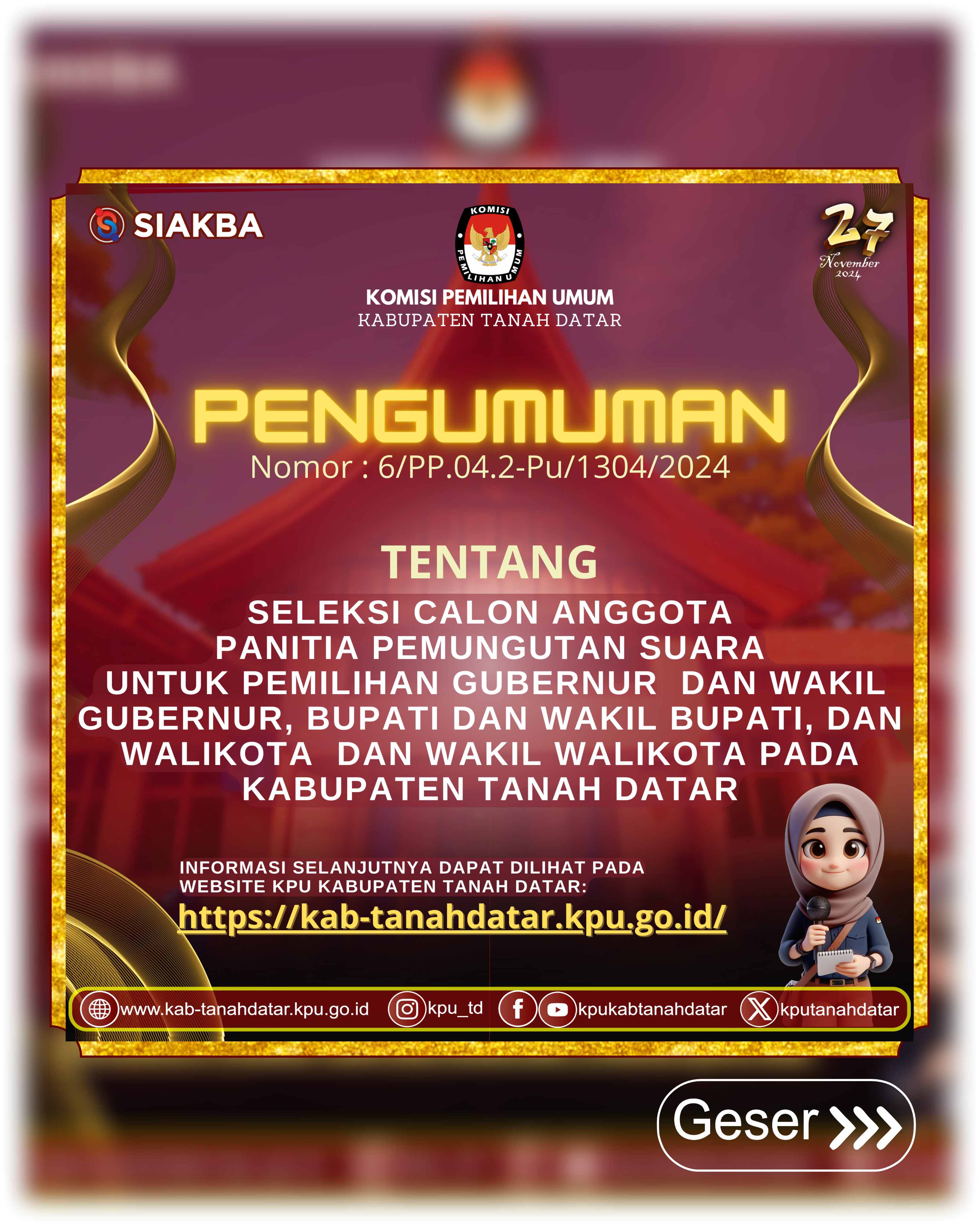 Pengumuman nomor 6/PP.04.2-Pu/1304/2024 tentang Seleksi calon anggota Panitia Pemungutan Suara untuk pemilihan Gubernur dan Wakil Gubernur, Bupati dan Wakil Bupati, dan Walikota dan Wakil Walikota pada Kabupaten Tanah Datar tahun 2024