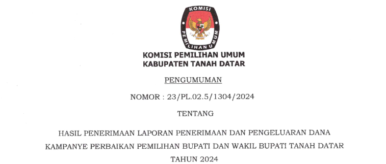PENGUMUMAN TENTANG HASIL PENERIMAAN LAPORAN PENERIMAAN DAN PENGELUARAN DANA KAMPANYE PERBAIKAN PEMILIHAN BUPATI DAN WAKIL BUPATI TANAH DATAR TAHUN 2024