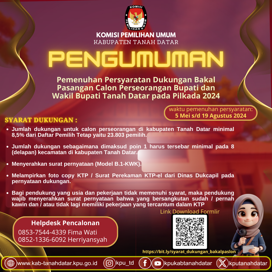 PENGUMUMAN TENTANG SYARAT MINIMAL DUKUNGAN BAKAL PASANGAN CALON PERSEORANGAN DALAM PEMILIHAN BUPATI DAN WAKIL BUPATI TANAH DATAR TAHUN 2024 Jumat, 26 April 2024 07:00 393 PENGUMUMAN klik disini LAMPIRAN klik disini Bagikan: Dilihat 393 Kali.