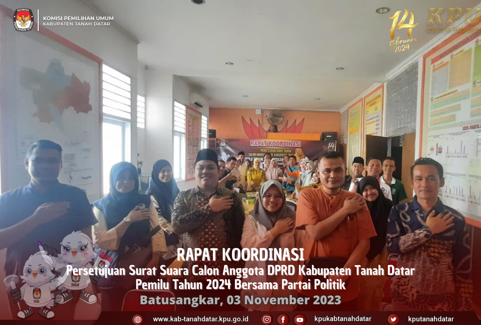 Batusangkar, Jum’at/ 3 November 2023 KPU Tanah Datar melakukan Rapat Koordinasi bersama-sama dengan Peserta Pemilu (Partai Politik) yang dihadiri oleh Ketua Parpol/ yang mewakili dan Penghubung (LO) Parpol dan Bawaslu Tanah Datar. Rapat koordinasi yang dilaksanakan di Ruangan Media Center KPU Tanah Datar ini dilakukan dalam rangka “Rapat Koordinasi Validasi Penyusunan Daftar Calon Tetap (DCT) Dan Surat Suara Anggota Dewan Perwakilan Rakyat Daerah Kabupaten Tanah Datar Pemilihan Umum Tahun 2024”.