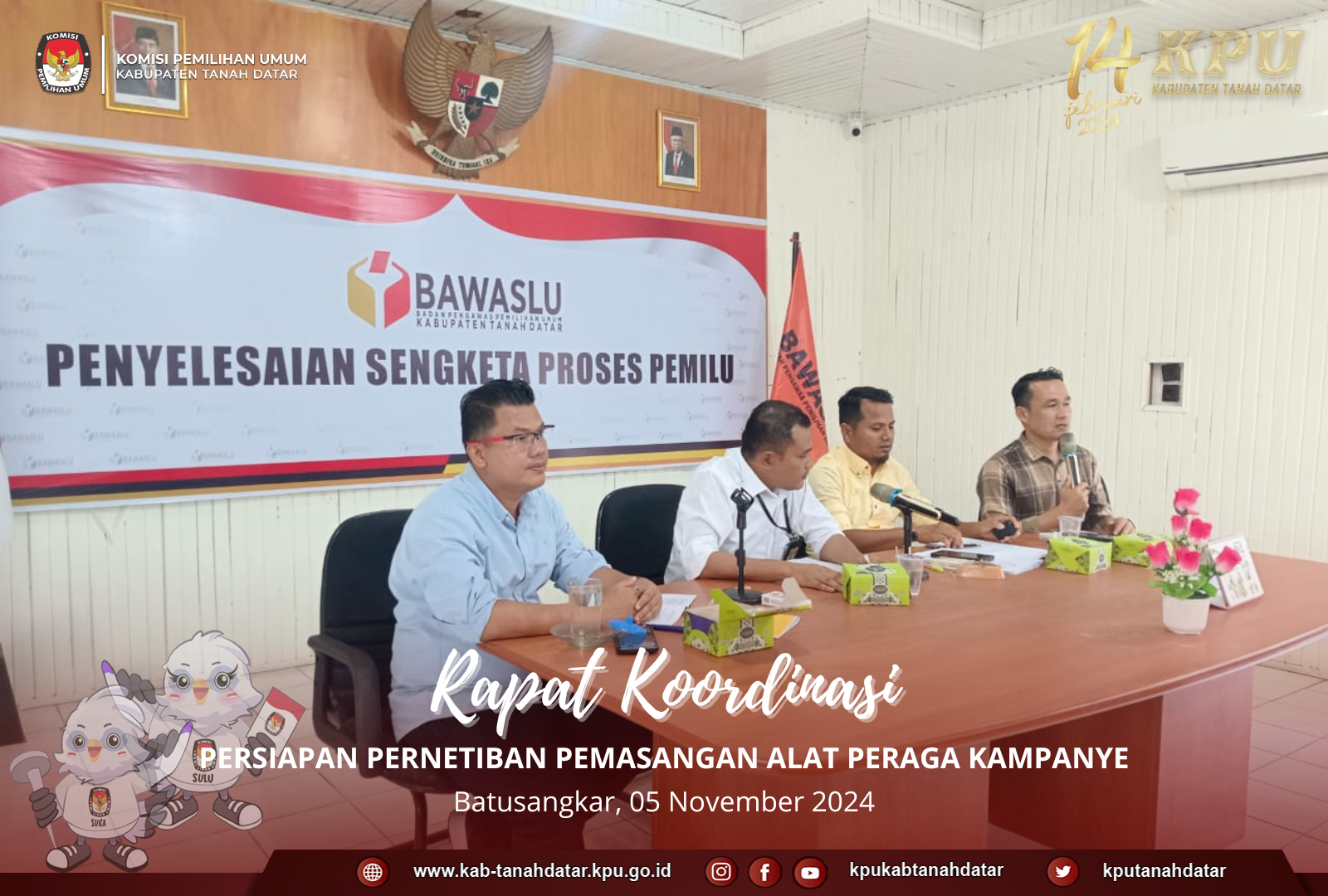 Batusangkar, -KPU Tanah Datar mengikuti Rapat koordinasi persiapan penertiban pemasangan alat peraga kampanye yang dilaksanakan oleh Bawaslu Tanah Datar, Rabu/16 November 2023. Rapat koordinasi tersebut dihadiri oleh Ketua Divisi Perencanaan, Data dan Informasi, Tomas Hendriko. Rapat ini juga diikuti oleh stakeholder terkait, milai dari Kesbangpol, Polres, Dandim 0307, Dinas Perhubungan, Satpol PP, Dinas Pendapatan dan juga dihadiri oleh Pimpinan Partai Politik di Kabupaten Tanah Datar.