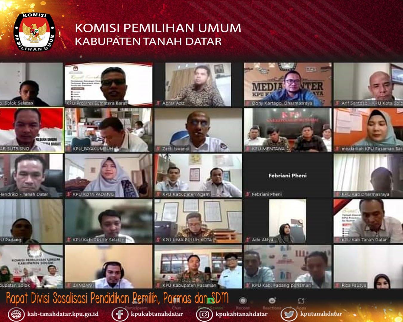 KPU Sumatera Barat menyadari akan pentingnya peran Website dan media sosial ini dengan kembali melakukan Rapat Divisi Sosalisasi Pendidikan Pemilih, Parmas dan SDM sebagai follow up dari Rapat Kerja yang telah dilakukan sebelumnya tanggal 18 mei 2022. kegiatan diikuti oleh ketua Divisi Sosalisasi Pendidikan Pemilih, Parmas dan SDM Kab/Kota se Sumatera barat, Kasubbag Tekmas dan Staf yang membidangi website dan Media sosial pada Senin 23 mei 2022 secara daring.