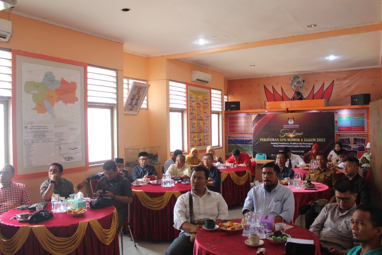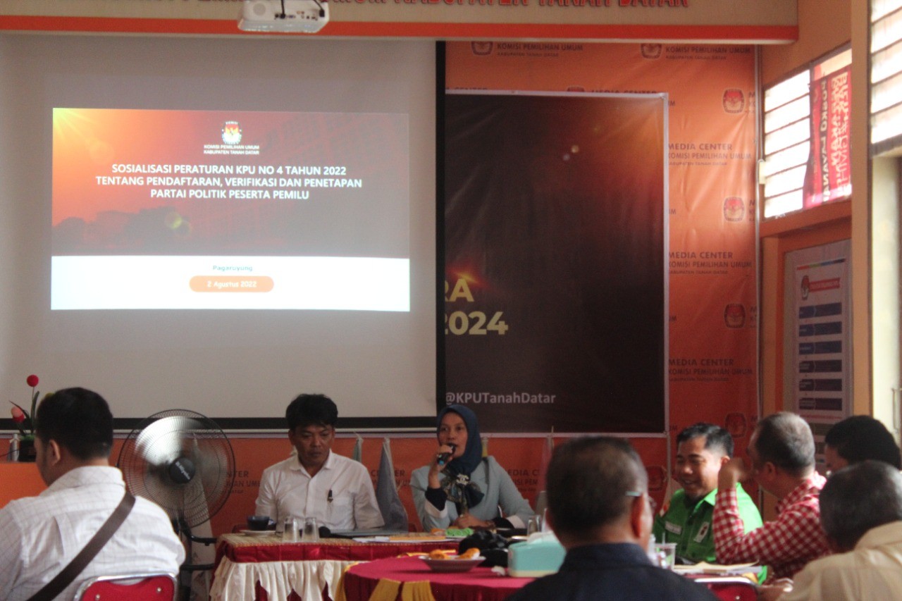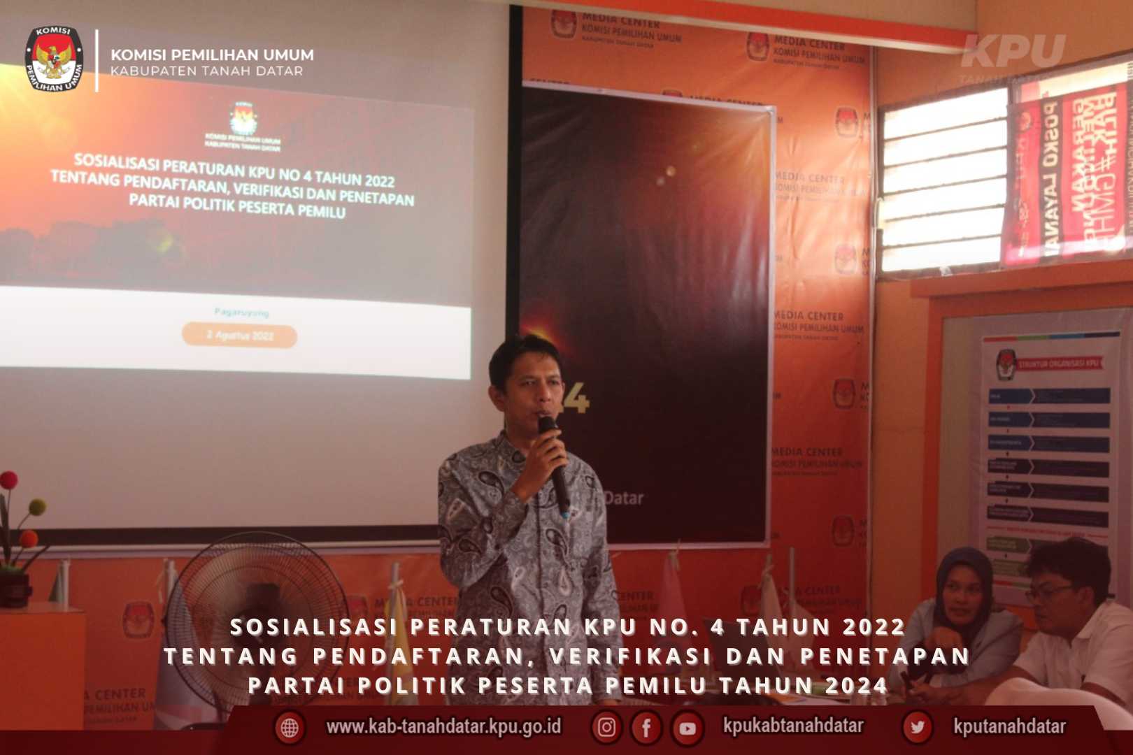 Batusangkar, kab-tanahdatar.kpu.go.id - #TemanPemilih, Hari ini Selasa/2 Aguatus 2022 KPU Tanah Datar melaksanakan Sosialisasi PKPU 4 2022 tentang Pendaftaran, Verifikasi dan Penetapan Partai Politik Peserta Pemilihan Umum anggota Dewan Perwakilan Rakyat dan Dewan Perwakilan Rakyat Daerah pada Pemilu tahun 2024.