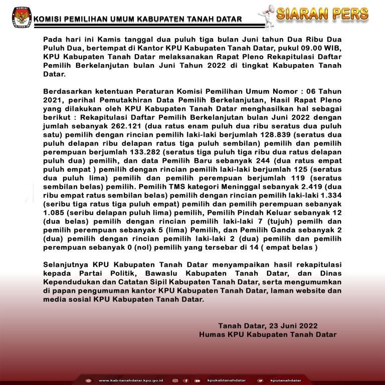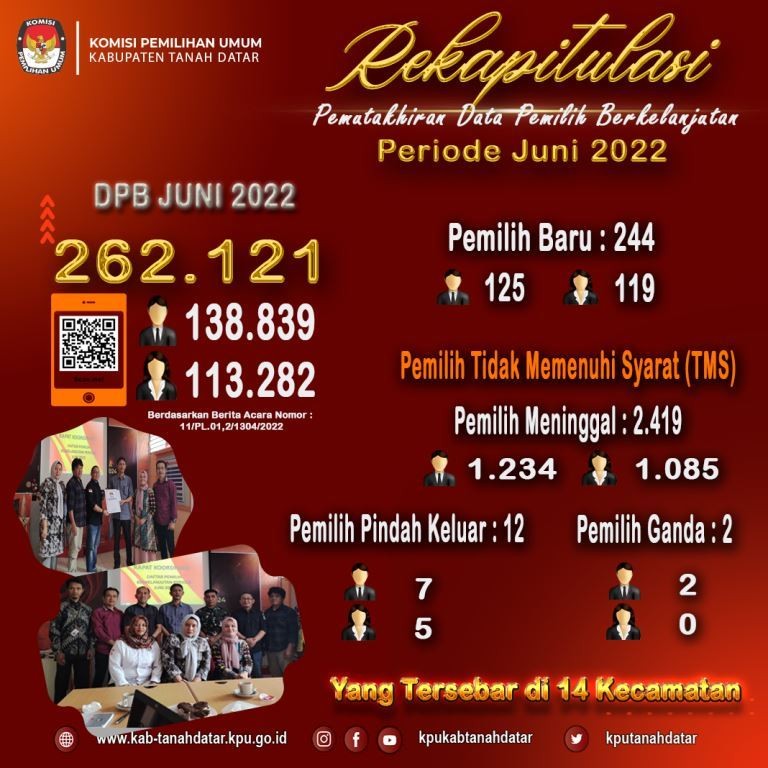 Adapun jumlah Daftar Pemilih Berkelanjutan Kabupaten Tanah Datar periode Juni 2022 yang ditetapkan adalah sebanyak 262.121 (dua ratus enam puluh dua ribu seratus dua puluh satu) pemilih yang tersebar di 14 ( empat belas) kecamatan.