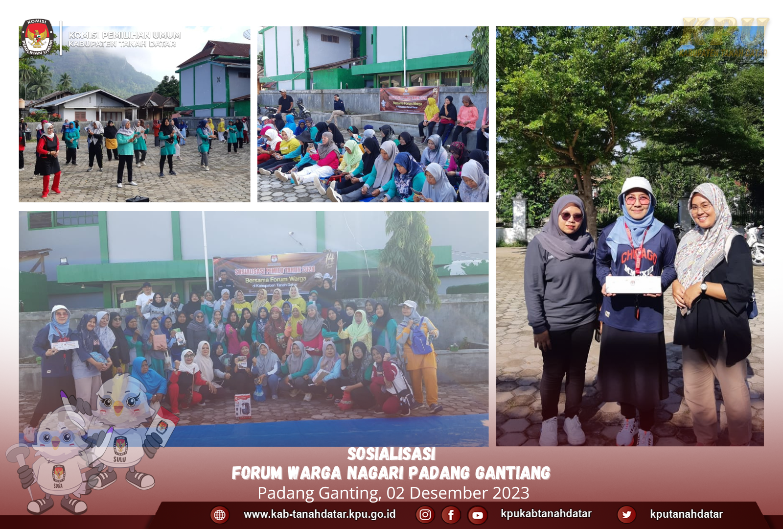 Sabtu, 2 Desember 2023 sosialisasi dilakukan di Nagari Padang Ganting, Kecamatan Padang Ganting, bersama Forum Warga Senam Jantung Sehat. Sosialisai dimulai dengan senam jantung sehat bersama dengan KPU pada pukul 07.30 WIB, dilanjutkan dengan Sosialisasi Tahapan Pemilihan Umum 2024. KPU menyampaikan hal-hal yang perlu dan penting diketahui oleh masyarakat. Sosialisasi dihadiri oleh Ketua Divisi Hukum dan Pengawasan KPU TD, Nini Karlina beserta jajaran secretariat KPU TD.